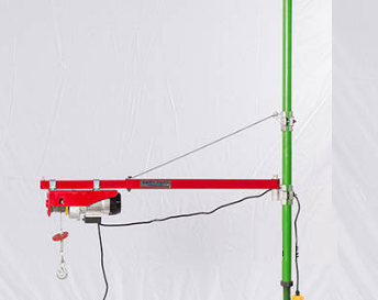 單立柱吊運機的結構非常簡單,它遵循的是“頂天立地”原則,安裝在地面和屋頂之間的立柱是借助著屋頂和地面之間的支撐力實現自己承受重物的能力,而立柱中間伸出來的水平支架是用來懸掛微型電動葫蘆的支架。