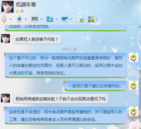 ? 一些的用戶在使用小型電動(dòng)葫蘆時(shí),會(huì)有一些自己的疑問(wèn),有的用戶甚至問(wèn)小編電動(dòng)葫蘆可以吊人不?下面我們就把詳細(xì)的聊天記錄展示給大家。